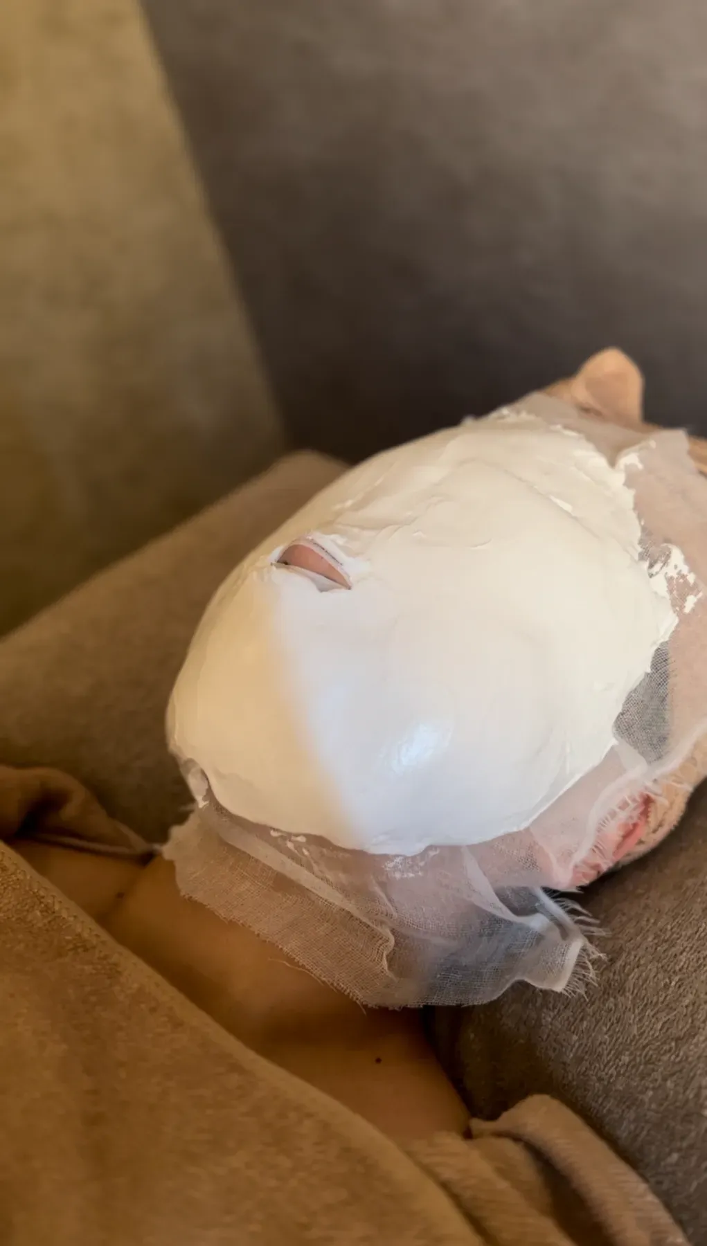 凝り固まった表情筋をしっかりほぐした後、石膏パックで肌に潤いとハリを与えます。